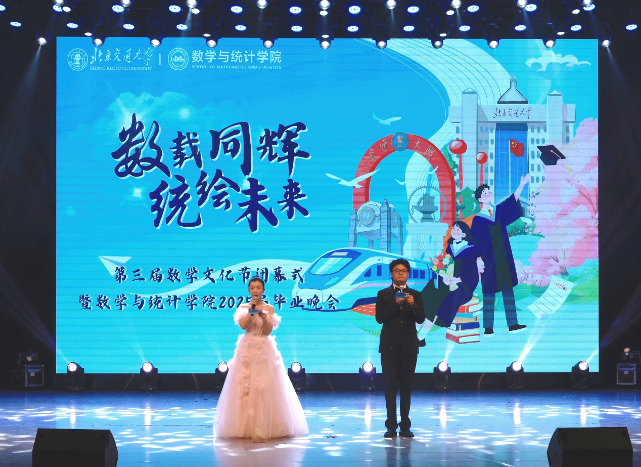 On June 13, 2025, the School of Mathematics and Statistics hosted the closing ceremony of the 3rd Mathematical Culture Festival, titled "Shining Together in Numbers, Shaping the Future", along with the 2025 Graduation Gala at Tianyou Hall. Attendees included Wang Meng, Deputy Director of Graduate Affairs of Beijing Jiaotong University, An Wei, Deputy Secretary of the Youth League Committee of Beijing Jiaotong University, Wang Hao, Deputy Party Secretary of the School of Mathematics and Statistics, Liu Yuting, Deputy Party Secretary and Vice Dean of the School of Mathematics and Statistics, along with faculty advisors, counselors, and teacher representatives from undergraduate and graduate graduating classes. Over 300 students, including the Class of 2025 and other students, gathered at Tianyou Hall to reminisce about their campus years and embrace the brilliant chapters ahead